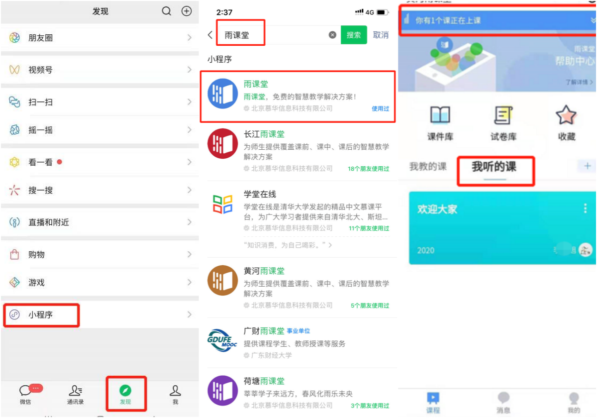 如在观看过程中不小心退出,也可以通过小程序重新进入直播页面中。在小程序中找到【雨课堂】,点击上方“正在听的课程”,再次进入直播课堂。