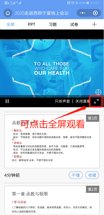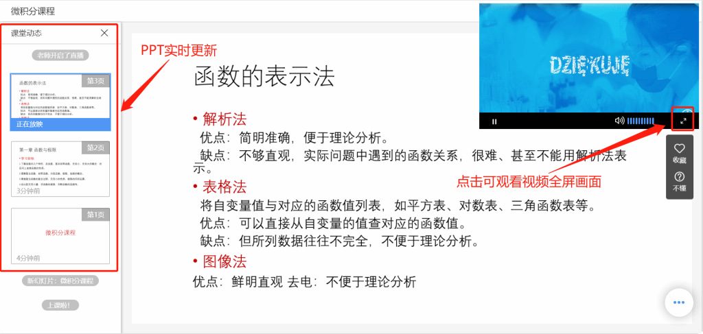 进入课程页面后,正在上课的课程将出现在页面上方。按照图1的箭头指示点击进入当前直播页面(图2),可点击右上角的直播画面全屏观看。