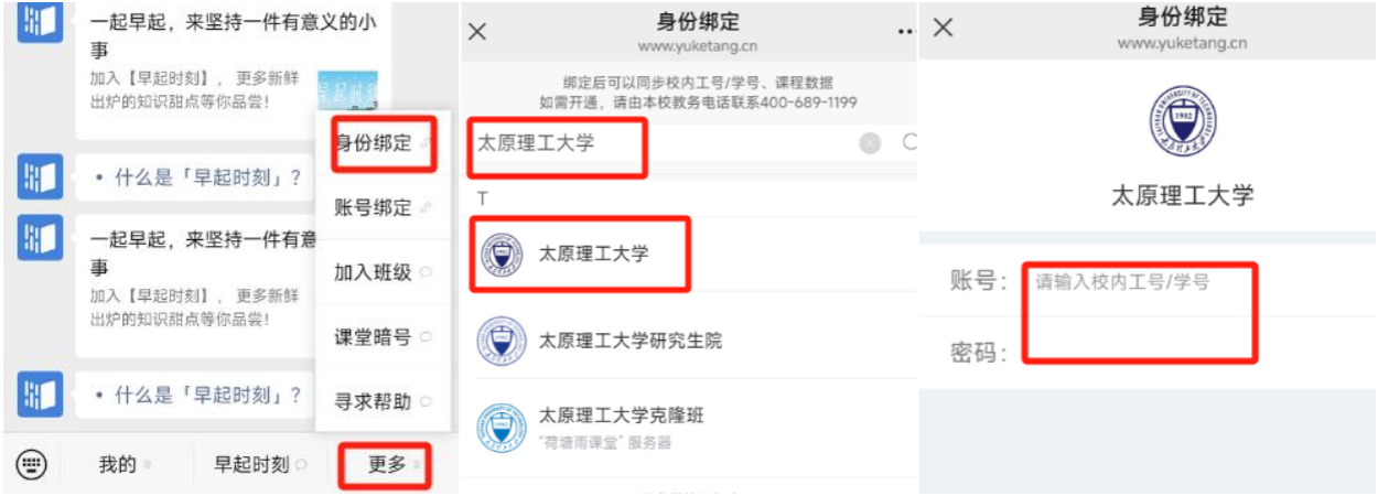 进入【雨课堂】微信公众号-点击【更多】-【身份绑定】-搜索【356体育在线官网】-根据页面提示完成身份绑定。