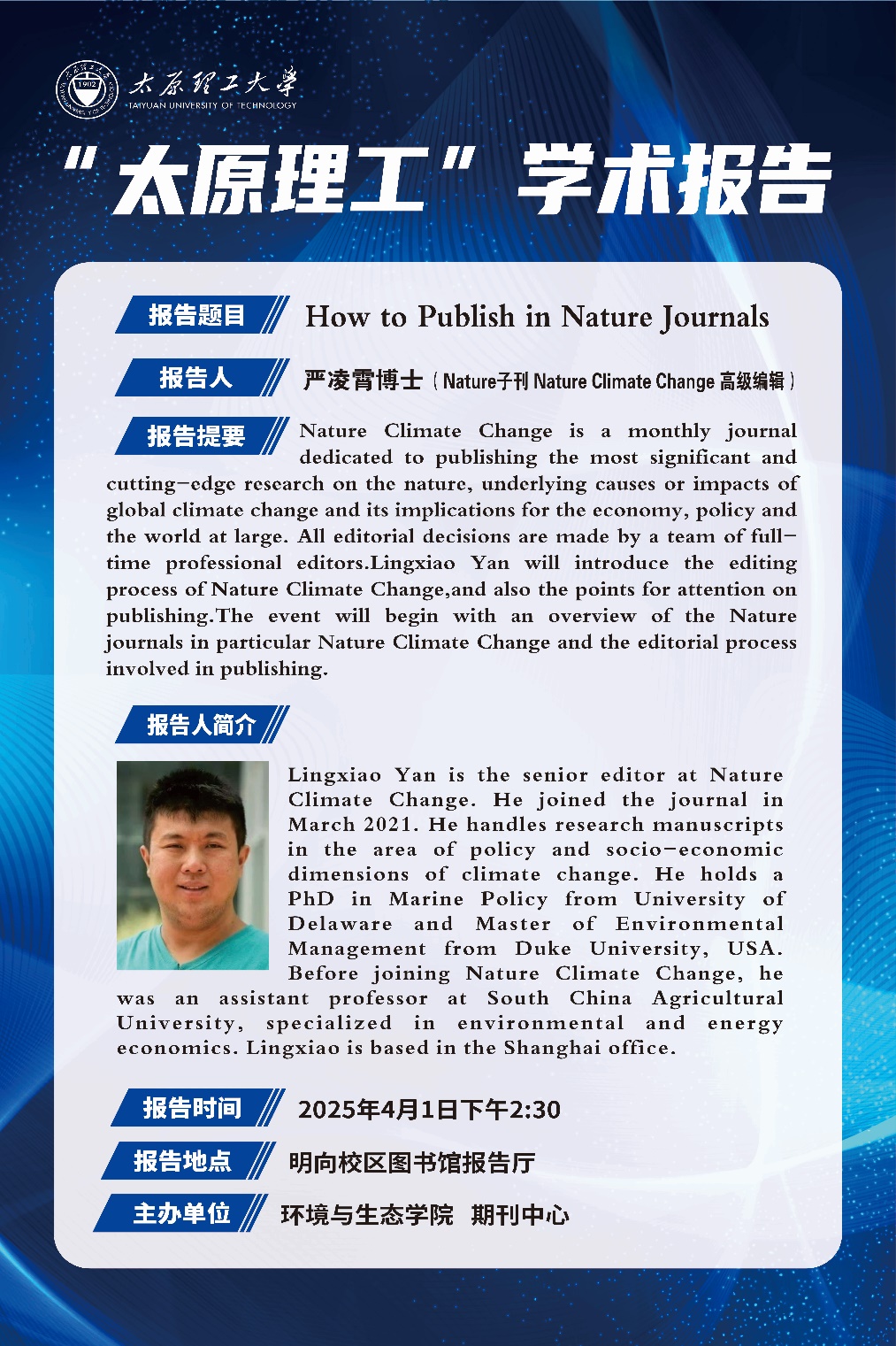 4月1日,356官网将邀请Nature子刊《Nature Climate Change》高级编辑严凌霄博士来校作主题报告,现将活动情况预告如下,欢迎全校师生参加报告会。