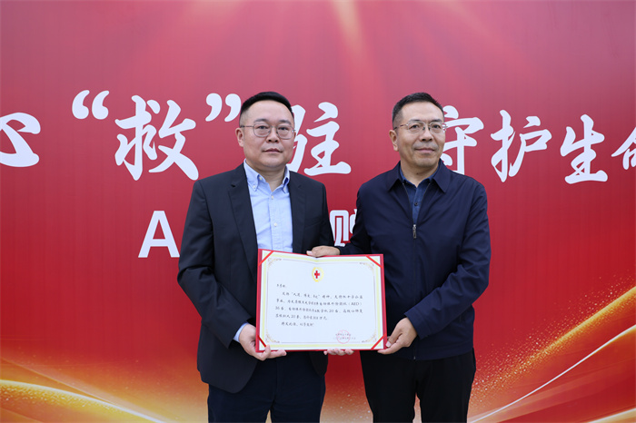 太原市红十字会党组书记、常务副会长张刚向牛彦琳总经理颁发了发扬“人道、博爱、奉献”精神、支持红十字公益事业的AED捐赠证书。