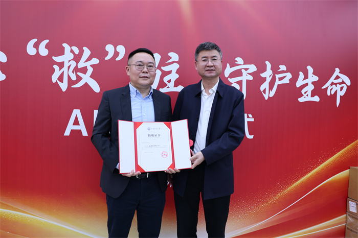 在隆重的氛围中,现场捐赠环节正式举行。桑胜波向牛彦琳总经理颁发了象征生命与希望的AED捐赠证书。