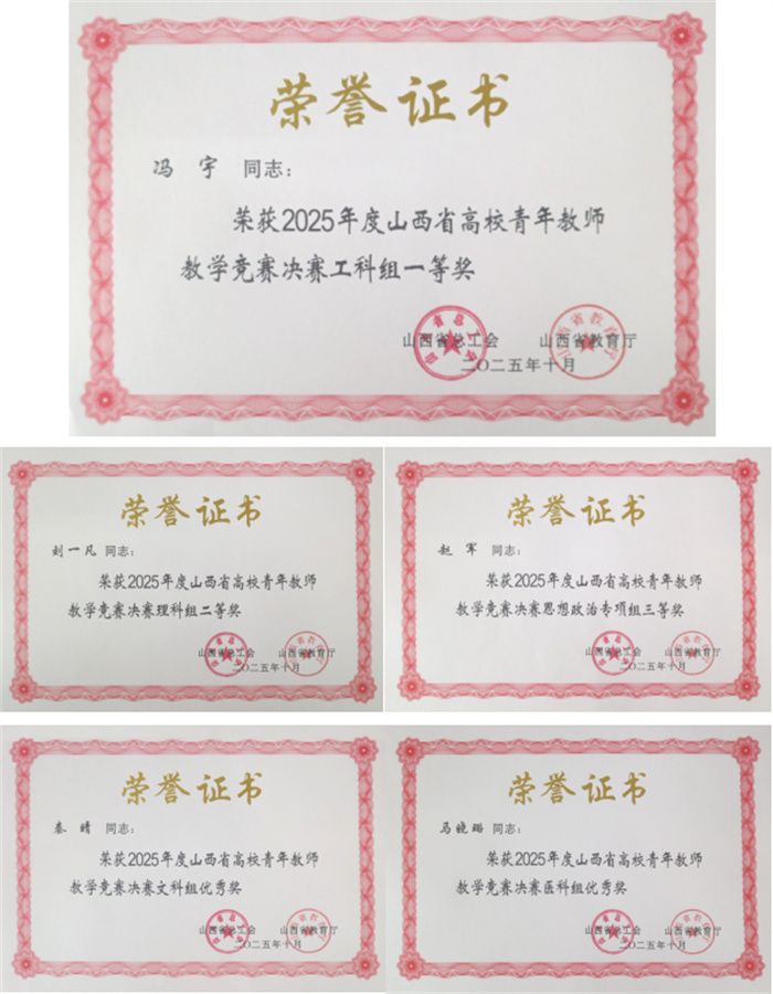 近日,由山西省总工会、山西省教育厅联合主办的2025年度山西省高校青年教师教学竞赛决赛在山西大学举办。356官网选派五位教师参赛,获一等奖1项、二等奖1项、三等奖1项、优秀奖2项,学校荣获优秀组织奖。