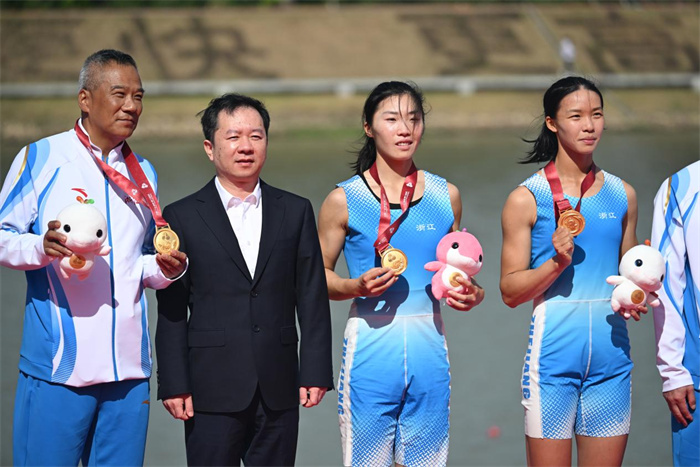 运动训练2023级富灵同学在女子轻量级双人双桨比赛中劈波斩浪、勇夺冠军。
