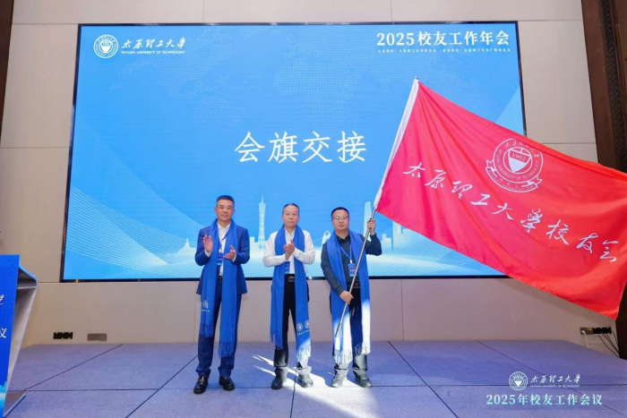 会议还举行了校友会会旗交接仪式。2026年校友工作年会将由天津校友会承办。任喜莹从广州校友会会长李连柱手中接过会旗,并正式移交至天津校友会会长张法彪。