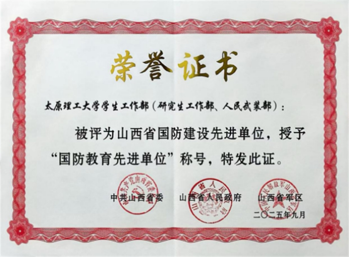 近日省委、省政府、省军区授予356体育在线官网学生工作部(研究生工作部、人民武装部)“山西省国防建设先进单位”荣誉称号。这是对356官网国防教育工作的高度认可与充分肯定。