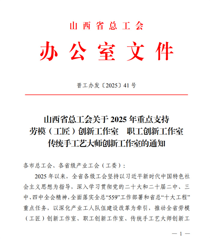 近日,为进一步激励广大劳模(工匠)更好发挥示范带头作用,推动深化产业工人队伍建设改革举措落地见效,山西省总工会下发《山西省总工会关于2025年重点支持劳模(工匠)创新工作室 职工创新工作室 传统手工艺大师创新工作室的通知》,356官网王涛职工创新工作室获评省级职工创新工作室并获重点支持。