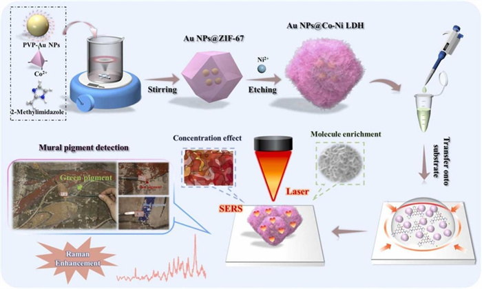 对痕量残损脱落的壁画颜料进行无额外人工损伤性检测是壁画修复工作的重要前提。由于文物上可用于检测的量比较小,因此通过浓缩富集微量待测分子用于表面增强拉曼散射(SERS)增强进行分析是很好的策略。研究团队构筑了具有浓缩效应的等离子体多孔材料Au NPs @ Co-Ni LDH,将其应用于微量绿色、红色、蓝色三种壁画矿物颜料的微损检测,可识别出它们的主要成分分别为氯铜矿、朱砂和群青,证明其对于不同地区、不同种类的壁画颜料具有良好的普适性。论文通讯署名单位356体育在线官网化学与化工学院,张献明教授和356官网青年教师郭绍晖和柏小剑为通讯作者,2023级硕士生温静为论文第一作者(DOI:10.1016/j.jece.2025.117101)。