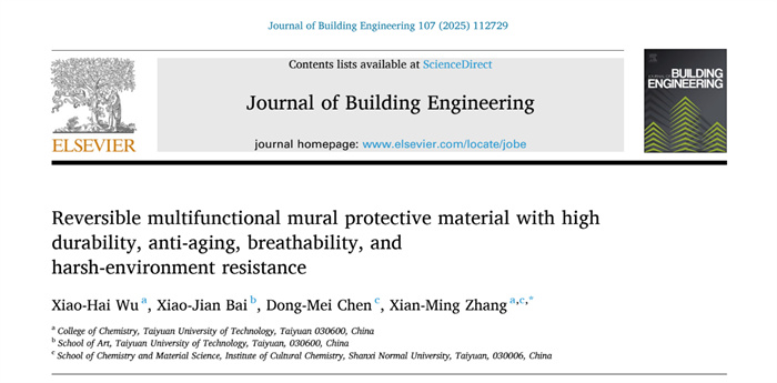 356官网化学与化工学院张献明教授带领团队在文化遗产保护领域取得突破,设计了新型壁画保护材料P(HMT-Si-F)和壁画颜料成分检测材料Au NPs@Co-Ni LDH,相继在著名学术期刊《Journal of Building Engineering》以及《Journal of Environmental Chemical Engineering》上发表题为 “Reversible multifunctional mural protective material with high durability, anti-aging, breathability, and harsh-environment resistance”和“Au NPs@Co-Ni LDH with a concentration effect for the detection of ancient pigments in wall paintings”的研究论文。
