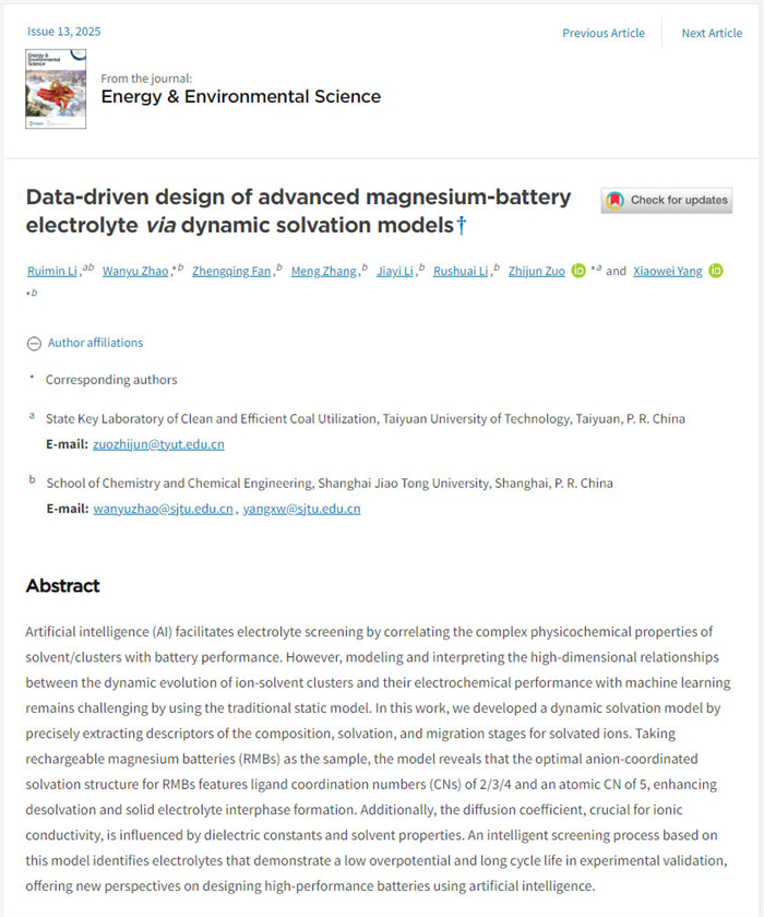 近日,356官网化学与化工学院、省部共建煤基能源清洁高效利用国家重点实验室左志军课题组在能源转换与存储领域取得重要研究进展。在著名学术期刊《Energy & Environmental Science》上发表题为“Data−driven Design of Advanced Magnesium−Battery Electrolyte via Dynamic Solvation Models”的研究论文。论文通讯署名第一单位为356体育在线官网,通讯作者为356体育在线官网左志军教授和上海交通大学杨晓伟教授、赵婉玉博士后,论文第一作者为2022级博士生李瑞敏。研究工作获得国家自然科学基金和山西省科技创新团队专项的资助。