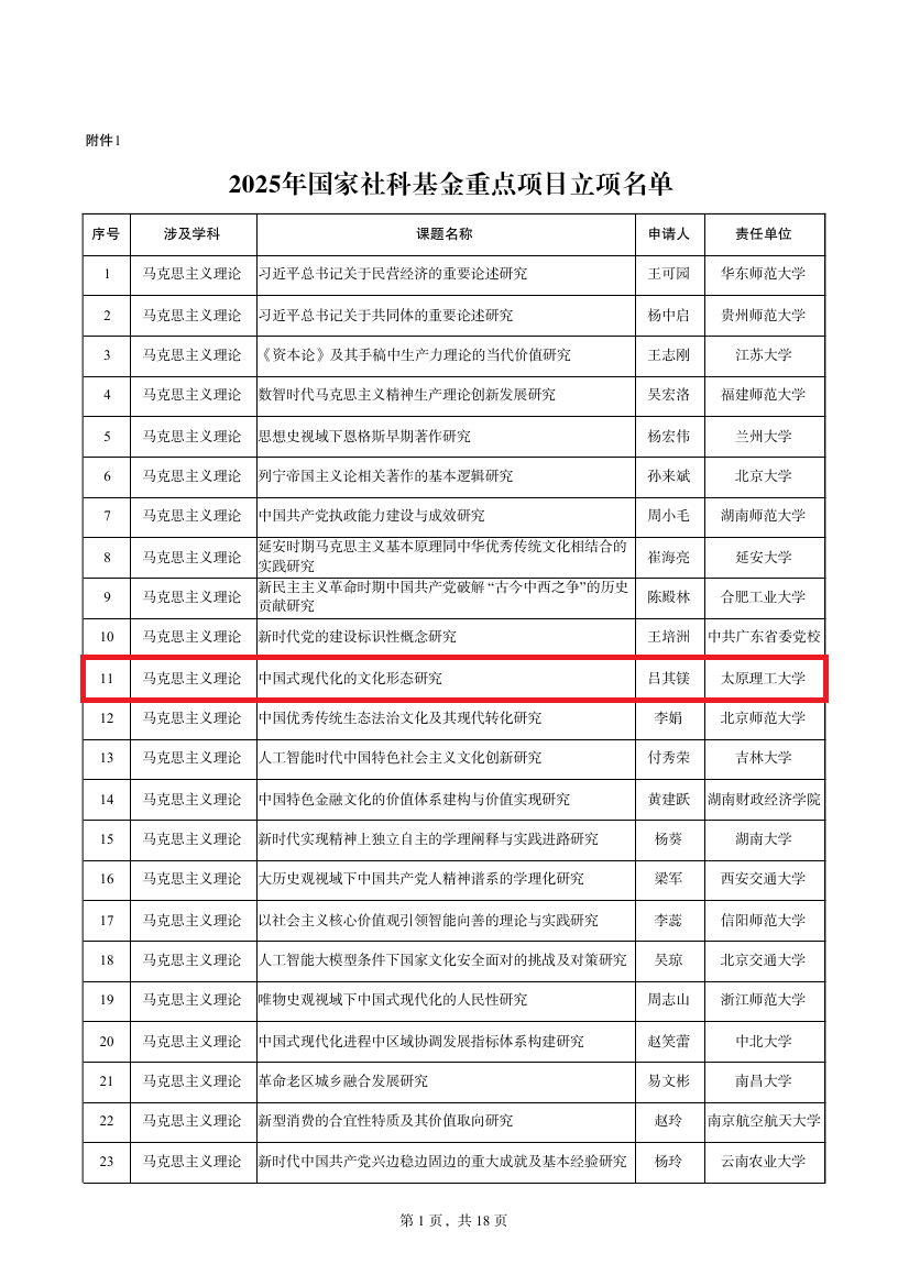 近日,全国哲学社会科学工作办公室发布《关于2025年国家社会科学基金年度项目立项名单的公示》,356官网马克思主义学院吕其镁老师申请的《中国式现代化的文化形态研究》成功获批重点项目立项,实现了356官网马克思主义学院在国家社科基金重点项目立项领域的历史性突破。