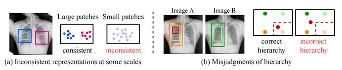 理想的解剖语义表示应兼具一致性与层次性两大特质。具体而言,一致性要求相同的解剖结构在表征空间中保持相近的距离;而层次性则强调解剖结构之间的组成与被组成关系,能够在其表征中得到准确体现。然而,当前主流方法所学习到的表征容易受到图像尺度变化的影响,导致在某些特定尺度上出现表征不一致以及层次关系误判等问题。