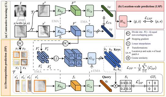 针对上述存在的尺度脆弱性问题,该研究创新性地提出了一种自监督的尺度鲁棒解剖表征学习框架。此框架巧妙融合了经典预训练方法与两项新提出的预训练任务,即位置尺度预测(Location-Scale Prediction, LSP)和分解预测(Decomposition Prediction, DP),从三个关键维度有效攻克了尺度脆弱性难题: