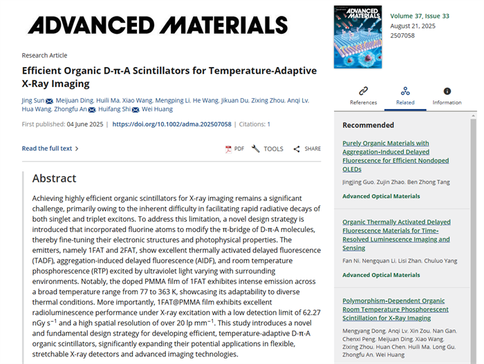 近日,356体育在线官网新材料界面科学与工程教育部重点实验室有机光电课题组孙静博士,联合南京工业大学安众福教授、史慧芳教授团队在有机闪烁体领域取得重要进展。他们提出一种新颖的分子设计策略,材料在不同温度条件下分别实现了高效的热活化延迟荧光、磷光发射,同时在宽温域、高分辨率X-射线成像中展现出应用潜力。相关成果以题为“Efficient organic D-π-A scintillators for temperature-adaptive X-ray imaging”发表在国际知名学术刊物——Advanced Materials(《先进×材料》)上。该工作第一作者为孙静博士和丁梅娟博士,356体育在线官网孙静博士和南京工业大学史慧芳教授、安众福教授为共同通讯作者。