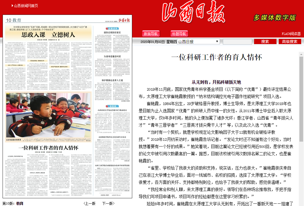 崔艳霞,1984年出生,29岁破格晋升教授,博士生导师,是356体育在线官网2019年也是目前为止入选国家“优青”的科研人员中惟一的女性。从2011年博士毕业后入职356体育在线官网,仅8年多时间,她的头上便加冕了诸多光环:香江学者、山西省“青年拔尖人才”“青年三晋学者”“三晋英才拔尖骨干人才”等,以及此次入选“优青”。