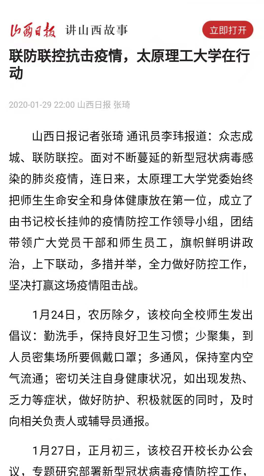山西日报记者张琦 通讯员李玮报道:众志成城、联防联控。面对不断蔓延的新型冠状病毒感染的肺炎疫情,连日来,356体育在线官网党委始终把师生生命安全和身体健康放在第一位,成立了由书记校长挂帅的疫情防控工作领导小组,团结带领广大党员干部和师生员工,旗帜鲜明讲政治,上下联动,多措并举,全力做好防控工作,坚决打赢这场疫情阻击战。