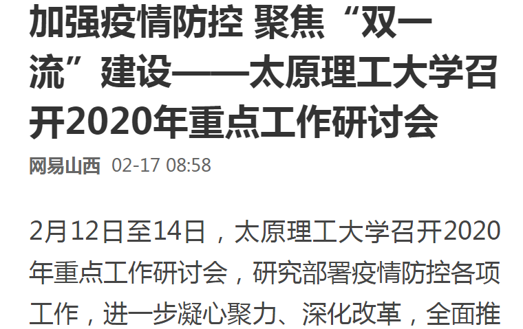 吴玉程强调,在这场疫情防控战中,全校师生展现出高度的责任感和使命感,以政治自觉和担当精神守住了防线,切实做到了有责任、有担当、有作为。对于今后疫情防控工作的开展,吴玉程指出,要提高政治站位,主动担当作为,压实工作责任;要继续把学生和教职工的安全健康放在第一位,保障学生培养质量和学校“双一流”建设不受影响;要确保工作方案和措施的制定,特别是今年的重点任务,高度契合学校发展的总体目标;要全面保障学校各项工作的开展,充分展现学校的执行力和实施力。对于新学期相关工作的开展,他要求扎实做好“三全育人”各项工作,保障学校春季学期的正常运行;要提前部署学科建设和创新发展方面的相关工作,全力做好学校人事、安全、后勤、基建等方面的保障工作,努力实现学校的预期目标。吴玉程强调,全校各职能部门和各学院及全体教职工要听从学校统一领导和统一指挥,各职能部门和各学院负责人要提高站位、靠前指挥,做好相关研判和预案,各学院要根据工作需要,采取灵活方式,在开学前将学校工作部署宣传到位,确保学校的安全稳定以及本学期各项工作目标和任务的完成。全校上下要在以习近平同志为核心的党中央坚强领导下,贯彻落实省委、教育部和省教育厅的各项工作部署,确保打赢疫情防控的人民战争、总体战、阻击战,为学校“双一流”建设提供更加坚实有力的保证。(网易山西 张丽 闫珊)