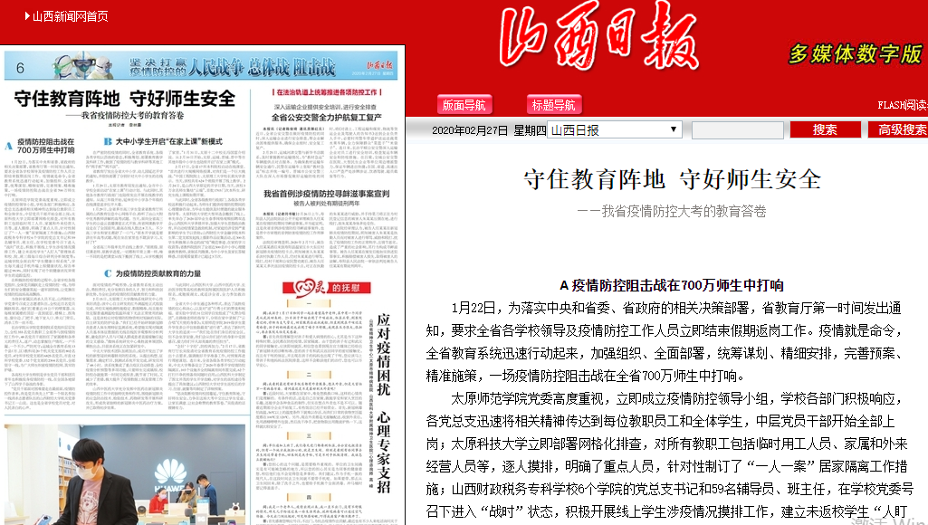 太原师范学院党委高度重视,立即成立疫情防控领导小组,学校各部门积极响应,各党总支迅速将相关精神传达到每位教职员工和全体学生,中层党员干部开始全部上岗;太原科技大学立即部署网格化排查,对所有教职工包括临时用工人员、家属和外来经营人员等,逐人摸排,明确了重点人员,针对性制订了“一人一案”居家隔离工作措施;山西财政税务专科学校6个学院的党总支书记和59名辅导员、班主任,在学校党委号召下进入“战时”状态,积极开展线上学生涉疫情况摸排工作,建立未返校学生“人盯人”管理体系和校、院、班三级每日综合研判分析制度等;运城学院全面启用“学生健康日报系统”,学生每天通过手机终端上报健康状况,报告率超过99.9%,同时实现了对个别健康状况异常学生的追踪监控。