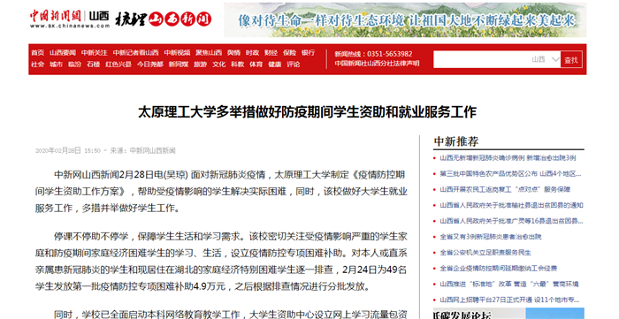 中新网山西新闻2月28日电(吴琼) 面对新冠肺炎疫情,356体育在线官网制定《疫情防控期间学生资助工作方案》,帮助受疫情影响的学生解决实际困难,同时,该校做好大学生就业服务工作,多措并举做好学生工作。