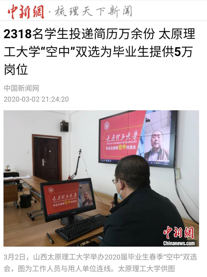 中新网太原3月2日电 (吴琼)“谢谢老师们的关心,我在湖北一切都好。我觉得这次双选会及时为企业和学生搭建了交流平台,为双方的需求实现对接,使我对就业更有信心。”3月2日,山西356体育在线官网举办2020届毕业生春季“空中”双选会,家住湖北省黄冈市的该校车辆工程专业2020届毕业生沈鹏亮通过视频介绍了自己的情况。