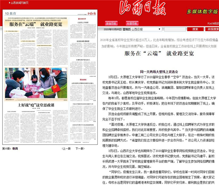 省高校毕业生就业指导中心设立专线开展了“网上办,不见面”服务活动,如网上办理学历认证、邮寄档案、办理省外就业报到手续等。356体育在线官网从2月6日起,每周在学校官网发布一期《线上招聘信息速递》,目前已发布三期,点击量达8.9万余次。山西农业大学注重对毕业生就业进行分类指导,全面开启线上办公,如签约手续网上登记,毕业生只需通过手机上传就业协议书和接收函的电子照片,学校即可对相关材料进行网上审核,该校食品学院还组建了考研复试交流微信群及各专业的就业群,为毕业生提供精准服务。山西工商学院组织毕业班辅导员、就业指导老师,与“建档立卡”等困难毕业生“一对一”指导沟通,有针对性地开展就业指导帮扶。太原科技大学坚持“离校不离心,就业不断线”,于2月20日在全省率先举办了网络视频招聘双选会,当天浏览量超10万次。