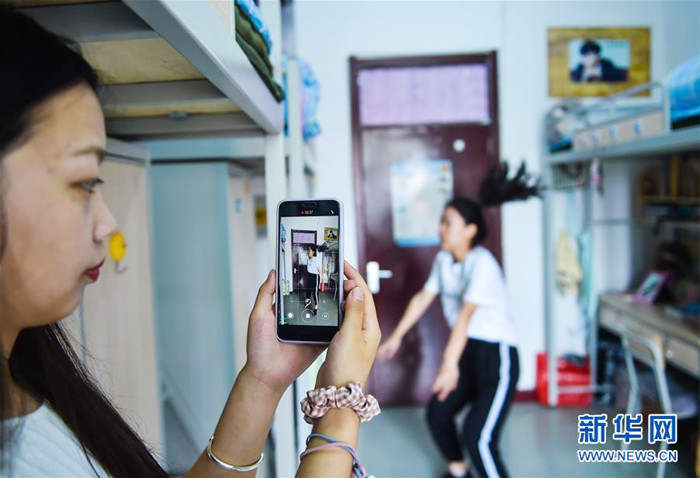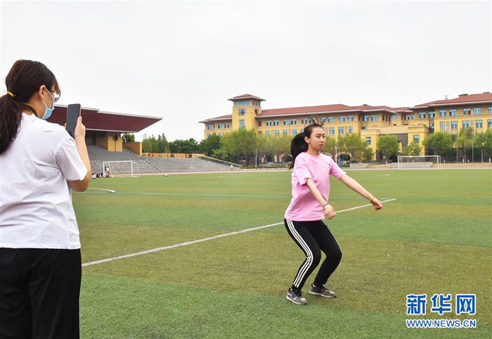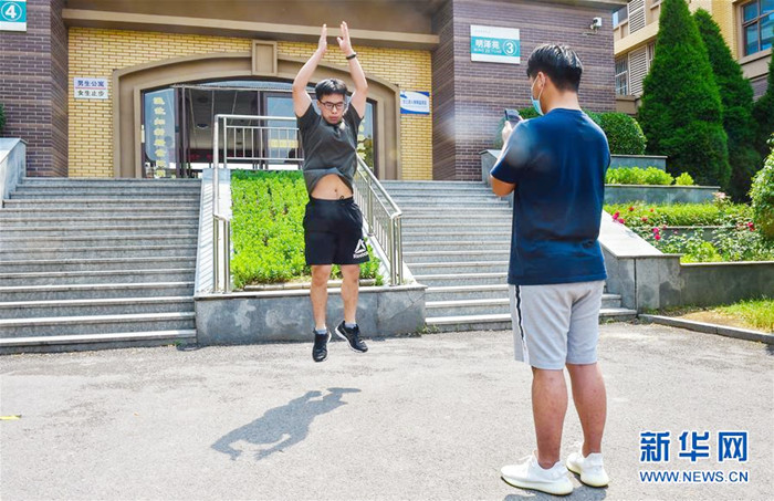 5月30日,安全与应急管理工程学院学生贾贝贝(左)直播同学郭宁一分钟深蹲跳的比赛过程。