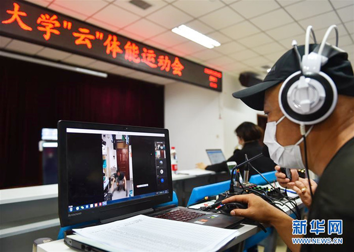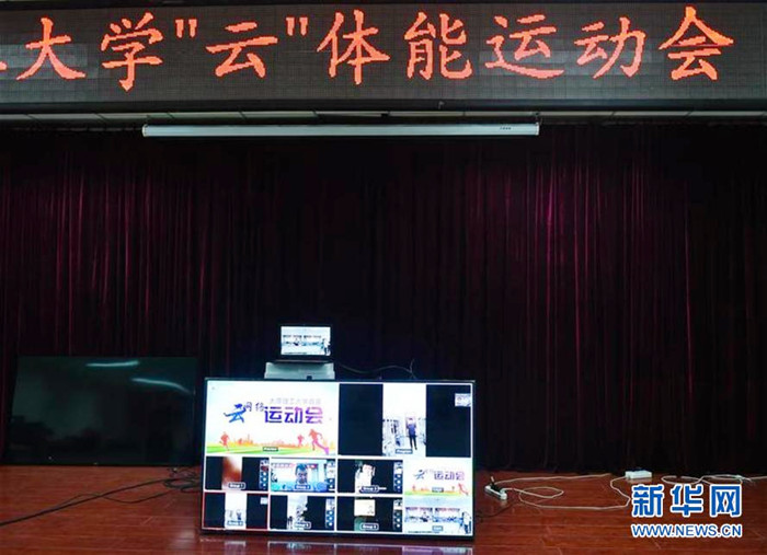 5月30日,电子屏幕上显示“云”体能运动会在进行中。