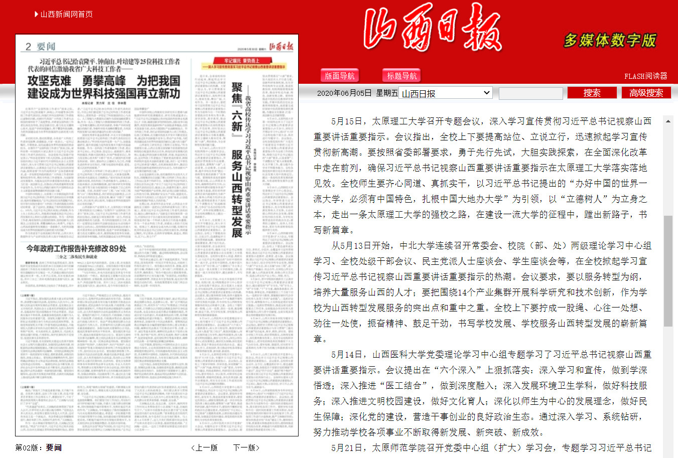 5月15日,太原科技大学第一时间传达学习了习近平总书记视察山西重要讲话重要指示;5月21日,该校召开理论学习中心组(扩大)学习会和处级干部大会,再次进行专题学习。会议指出,全校各级党组织和广大党员干部要坚定不移把习近平总书记视察山西重要讲话重要指示作为全部工作的统领,围绕习近平总书记提出的“六新”要求,以及省委“三个调整优化”重大决策部署,扎实开展工作,着力提升办学水平和服务能力。全校各级党组织要自觉在我省经济社会发展大局中找准定位,蹚出一条高校改革发展的新路,为我省转型发展作出更大贡献。
