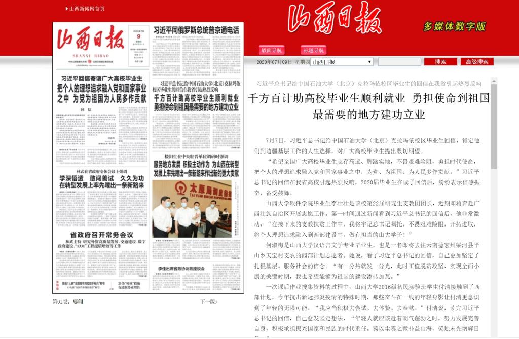 7月7日,习近平总书记给中国石油大学(北京)克拉玛依校区毕业生回信,肯定他们到边疆基层工作的人生选择,对广大高校毕业生提出殷切期望。