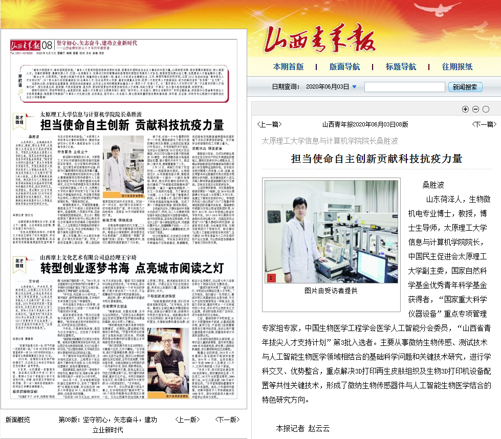 上述成绩的取得,仅仅是桑胜波取得成果的一个缩影。自2010年从德国博士毕业进入356体育在线官网以来,他建立了微纳系统研究中心,带领团队先后入选山西省“1331”工程重点领域创新团队和重点实验室、高端微纳传感器与系统山西省创新团队等,分别于2013年、2019年获得山西省科学技术奖。2017-2018年以高级访学者身份访问哈佛大学,归国后依托山西省“1331”重大基础科研及国家、省部级项目支撑,与哈佛医学院、太钢总医院进行了深度合作,联合建设“山西人工智能生物医学研究院”,全力推动3D再生装备与人工仿生组织的产业化发展,为山西转型发展提供了强有力的科技支撑。