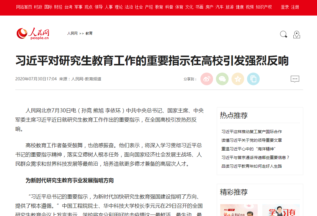 人民网北京7月30日电(孙竞 熊旭 李依环)中共中央总书记、国家主席、中央军委主席习近平近日就研究生教育工作作出的重要指示,在全国高校引发热烈反响。