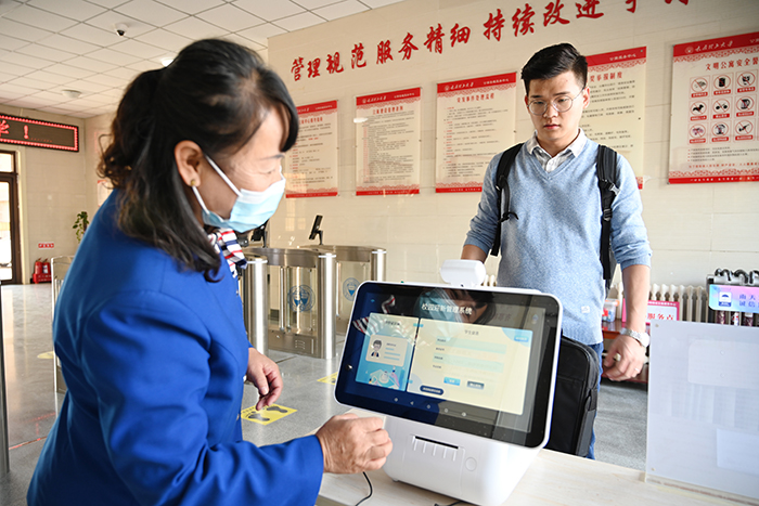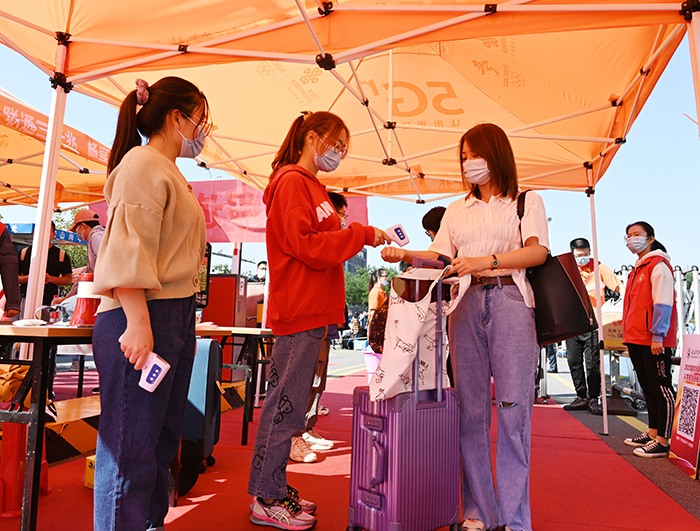 山西日报记者王瑞瑞摄影报道:9月19日,356体育在线官网2020级新生报到,该校今年共迎来7800余名本科生和3400余名研究生。为切实做好常态化疫情防控工作,学校依托数字迎新平台,尽可能简化程序,为新生提供全程无忧的“一站式”报到服务,学生只需测量体温和刷取验证码即可报到入校,刷取身份证和识别人脸即可入住宿舍。明向校区还在校门外放置了电视屏幕,送新生的家长可在校门外通过直播方式实时关注新生报到情况。