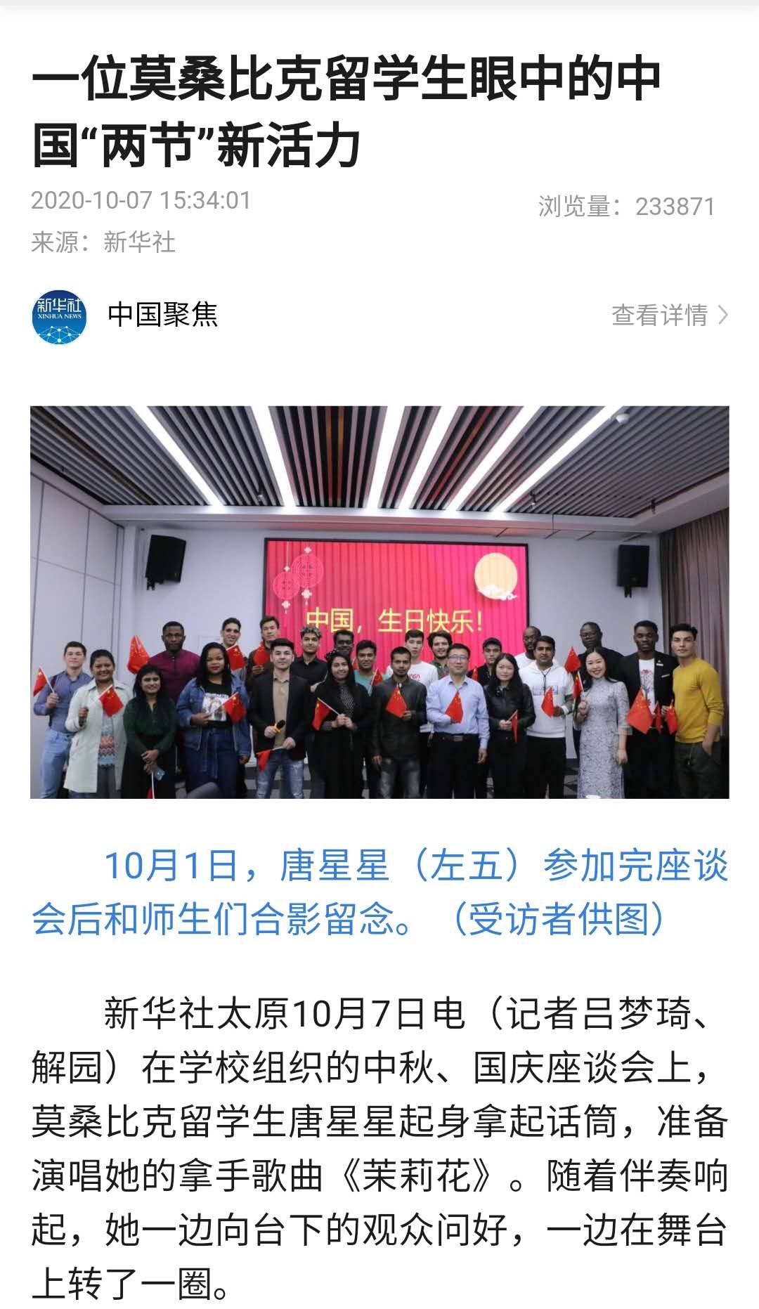 新华社太原10月7日电(记者吕梦琦、解园) 在学校组织的中秋、国庆座谈会上,莫桑比克留学生唐星星起身拿起话筒,准备演唱她的拿手歌曲《茉莉花》。随着伴奏响起,她一边向台下的观众问好,一边在舞台上转了一圈。