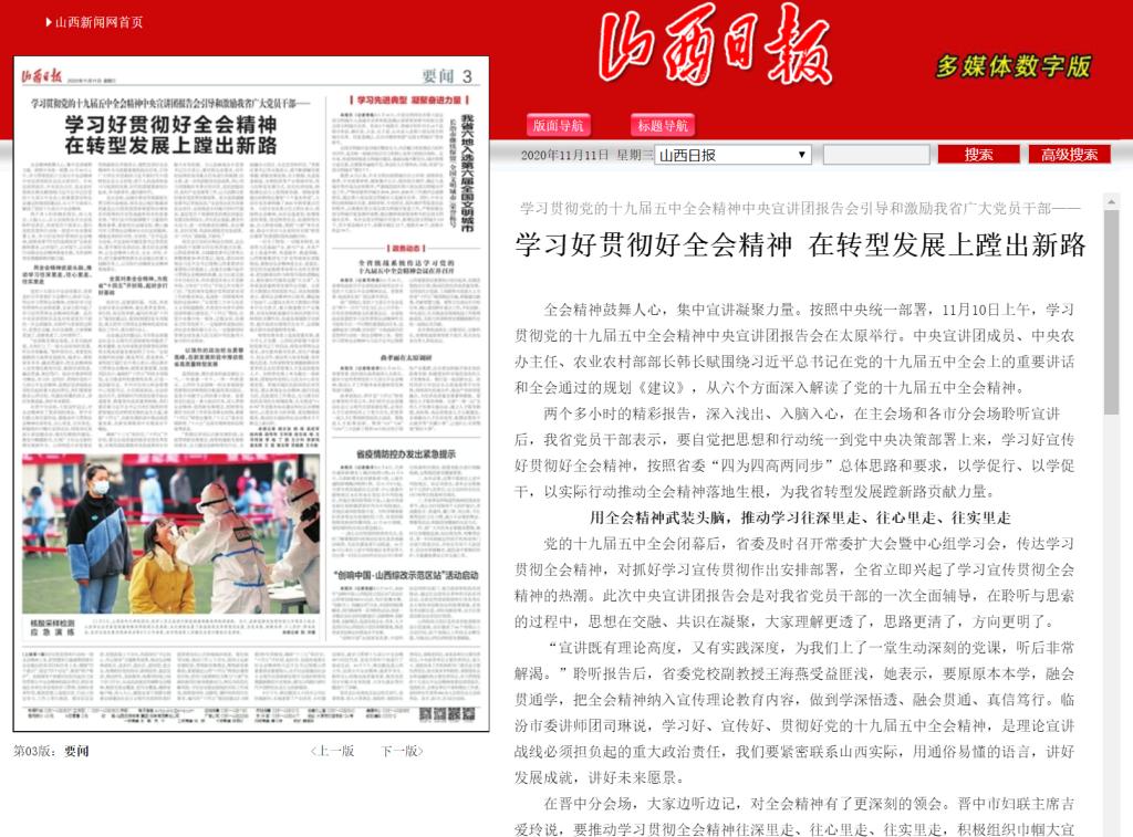 全会通过的《建议》,为夺取全面建设社会主义现代化国家新胜利提供了根本遵循,也为我省推进资源型经济转型实现高质量发展指明了方向。“全面加强科技创新,既是责任,更是使命。”省科技厅副厅长牛青山表示,将认真学习贯彻全会精神,按照省委部署,加强顶层设计,编制好“十四五”科技专项规划,全力推进科技重塑性改革,打造一流创新生态。忻州市住房公积金管理中心党组书记、主任胡高裕说,全会的成功召开,表明新时代我国发展开始由速度型、数量型向高质量型转换,我们要沿着习近平总书记为我们指明的资源型地区经济转型发展的金光大道,谋篇“十四五”,在新发展阶段中推动高质量发展,在新发展格局中实现高水平崛起。