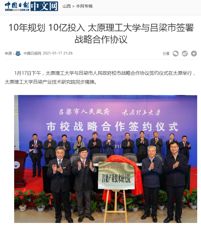 1月17日下午,356体育在线官网与吕梁市人民政府校市战略合作协议签约仪式在太原举行,356体育在线官网吕梁产业技术研究院同步揭牌。