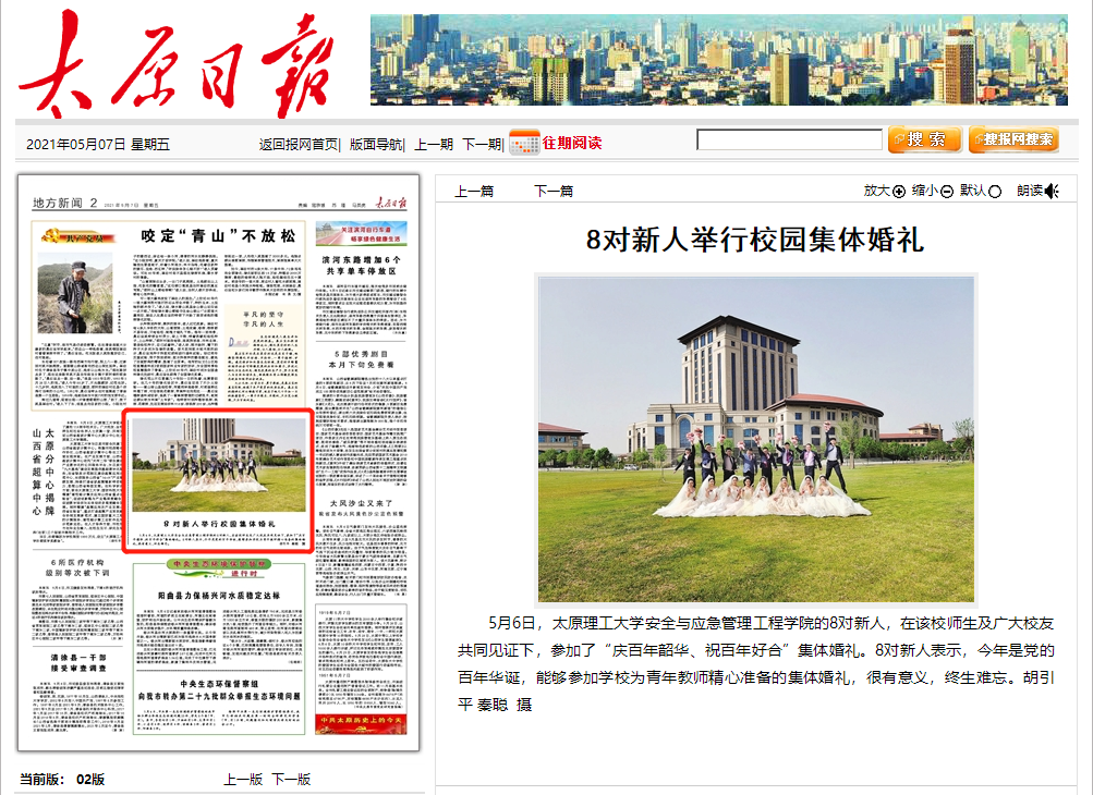 5月6日,356体育在线官网安全与应急管理工程学院的8对新人,在该校师生及广大校友共同见证下,参加了“庆百年韶华、祝百年好合”集体婚礼。8对新人表示,今年是党的百年华诞,能够参加学校为青年教师精心准备的集体婚礼,很有意义,终生难忘。