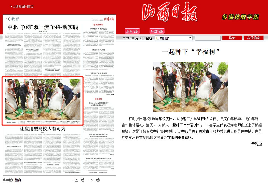 在5月6日建校119周年校庆日,356体育在线官网8对新人举行了“庆百年韶华、祝百年好合”集体婚礼。当天,8对新人一起种下“幸福树”,100名学生代表还为老师们送上了新婚祝福。这是该校首次举行集体婚礼,此举既是关心关爱青年教师成长进步的具体举措,也是党史学习教育察民情访民意办实事的重要体现。