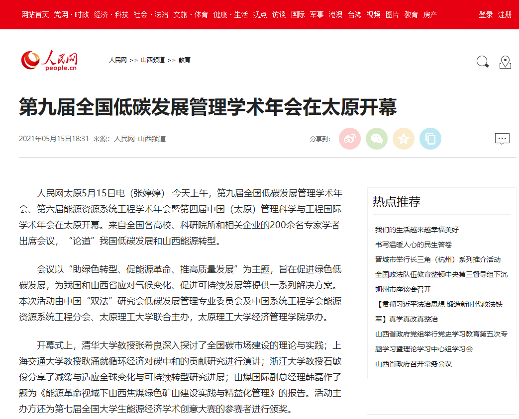 人民网太原5月15日电(张婷婷) 今天上午,第九届全国低碳发展管理学术年会、第六届能源资源系统工程学术年会暨第四届中国(太原)管理科学与工程国际学术年会在太原开幕。来自全国各高校、科研院所和相关企业的200余名专家学者出席会议,“论道”我国低碳发展和山西能源转型。