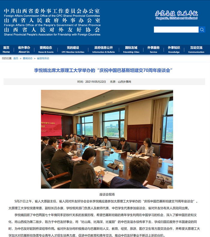 5月21日上午,省人大原副主任、省人民对外友好协会会长李悦娥应邀参加356体育在线官网举办的“庆祝中国巴基斯坦建交70周年座谈会”。356体育在线官网校党委常委、副校长吕永康,学校相关部门负责人及教师代表、中巴学生代表参加座谈会,省对外友协有关人员陪同出席。