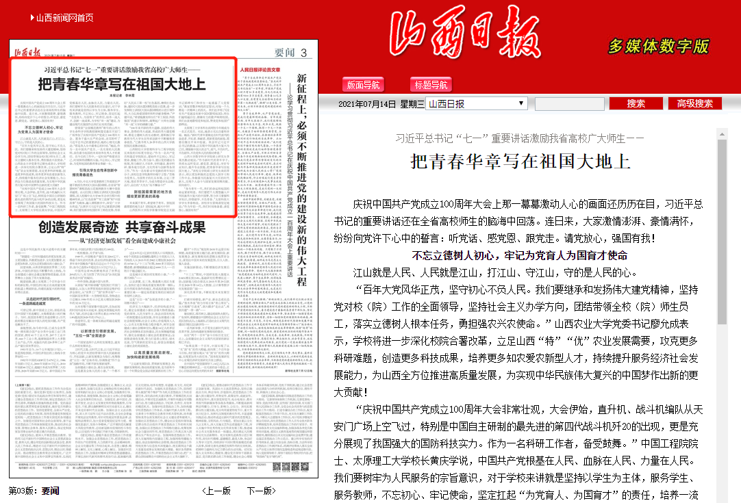 “百年大党风华正茂,坚守初心不负人民。我们要继承和发扬伟大建党精神,坚持党对校(院)工作的全面领导,坚持社会主义办学方向,团结带领全校(院)师生员工,落实立德树人根本任务,勇担强农兴农使命。”山西农业大学党委书记廖允成表示,学校将进一步深化校院合署改革,立足山西“特”“优”农业发展需要,攻克更多科研难题,创造更多科技成果,培养更多知农爱农新型人才,持续提升服务经济社会发展能力,为山西全方位推进高质量发展,为实现中华民族伟大复兴的中国梦作出新的更大贡献!