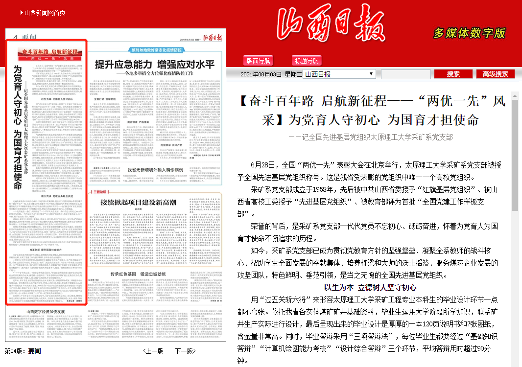 采矿系党支部不断创新学习模式、管理模式和服务模式,紧密围绕国家能源革命和山西转型发展,实现了党建工作与教学科研、学科专业的全面提升。