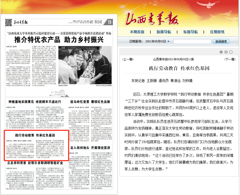 活动中,实践队队员走进灵石武警中队参观学习部队生活,从学习品质转为发扬精神,真正落实大学生劳动教育,将吃苦耐劳精神融于劳动实践中,认真学习且集中采摘西红柿、黄瓜、豆角等当季蔬果,并用三天时间分装了150包蔬菜包。随后,队员们在镇政府门口为当地群众分发蔬菜。队员们分别进行递菜、登记姓名和发菜的工作,并与老人合影留念。村民们激动地说:“这个活动已经举办了多次,体现了军民一家亲的深情厚谊,这次又加入了大学生,他们不顾暴晒为我们摘菜,我们很高兴。为军人点赞,为大学生点赞。”