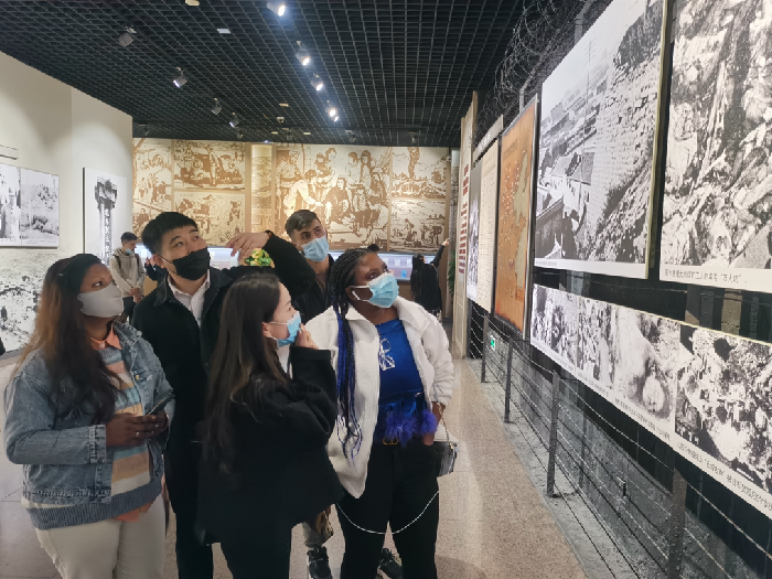 在八路军太行纪念馆,中外师生一一结对,近距离参观了华北《新华日报》印刷厂使用过的铸字机、晋冀鲁豫边区政府布告、反法西斯联盟旗帜等馆藏文物和国际主义战士白求恩在晋察冀边区救治伤员时所使用临时场所的复刻实景等,直观感受了侵华日军与中国八路军在武器装备、后勤保障等方面的差异,系统了解了抗日根据地的创建发展历程和平型关大捷、百团大战等经典战役的背景和意义,深刻体会了毛泽东在《论持久战》中提出的“兵民是胜利之本”重要论断。