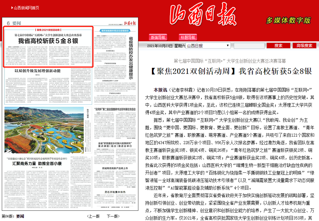 据悉,第七届中国国际“互联网+”大学生创新创业大赛以“我敢闯、我会创”为主题,围绕“更中国、更国际、更教育、更全面、更创新”目标,设置了高教主赛道、“青年红色筑梦之旅”赛道、职教赛道、萌芽赛道、产业赛道5个赛道,共吸引了来自121个国家和地区的4347所院校、228万余个项目、956万余人次报名参赛。经过激烈角逐,我省团队在高教主赛道斩获金奖3项、银奖4项、铜奖26项;“青年红色筑梦之旅”赛道斩获银奖2项、铜奖10项;职教赛道斩获银奖2项、铜奖7项;产业赛道斩获金奖2项、铜奖4项,创历史新高。我省此次获得的5项金奖包括:山西医科大学的“瑞博生物—新型干细胞治疗缺血性疾病的开创者”项目,356体育在线官网的“百炼钢化为绕指柔—手撕钢钢铁工业皇冠上的明珠”“绿智液驱—全球高端装备低碳液压驱动技术引领者”以及“减隔震装置大流量需求下动态伺服液压控制”“AI智能掌超设备及辅助诊断系统”4个项目。
