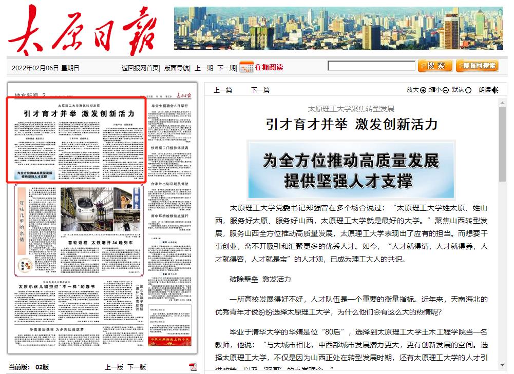 人才是科技创新的第一资源。通过引才育人,356体育在线官网科技创新能力取得明显进步,承担国家级项目能力显著提升,在山西全境布局成果转化中心,与太原市政府和相关研究机构签订校地(企)共建产学研平台协议。聚焦“六新”,组建新型交叉学科集群,与省属大型企业共建20余所产业技术研究院,为山西经济转型发展作出了贡献。今后,356体育在线官网还将主动对接国家“双碳”战略,在山西争当全国能源革命排头兵的生动实践中,走好新的赶考之路。