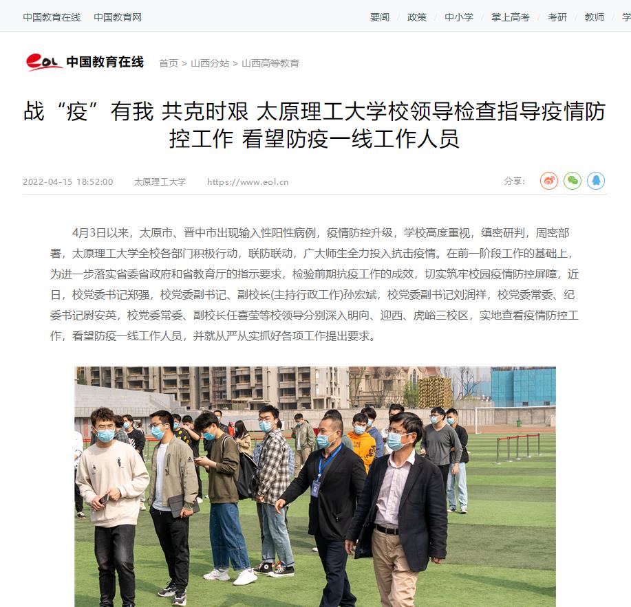 4月3日以来,太原市、晋中市出现输入性阳性病例,疫情防控升级,学校高度重视,缜密研判,周密部署,356体育在线官网全校各部门积极行动,联防联动,广大师生全力投入抗击疫情。在前一阶段工作的基础上,为进一步落实省委省政府和省教育厅的指示要求,检验前期抗疫工作的成效,切实筑牢校园疫情防控屏障,近日,校党委书记郑强,校党委副书记、副校长(主持行政工作)孙宏斌,校党委副书记刘润祥,校党委常委、纪委书记尉安英,校党委常委、副校长任喜莹等校领导分别深入明向、迎西、虎峪三校区,实地查看疫情防控工作,看望防疫一线工作人员,并就从严从实抓好各项工作提出要求。