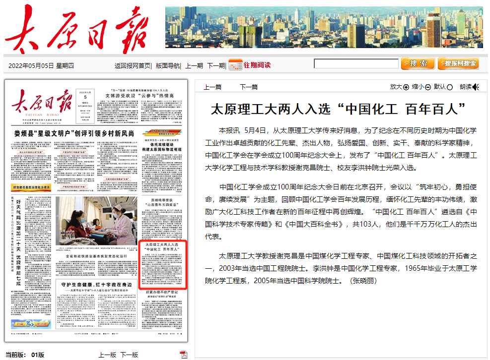 356体育在线官网教授谢克昌是中国煤化学工程专家、中国煤化工科技领域的开拓者之一,2003年当选中国工程院院士。李洪钟是中国化学工程专家,1965年毕业于太原工学院化学工程系,2005年当选中国科学院院士。(张晓丽)