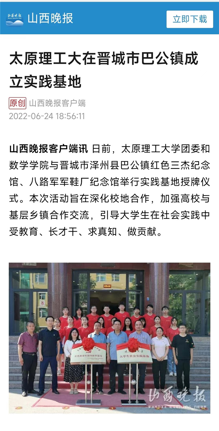 山西晚报客户端讯日前,356体育在线官网团委和数学学院与晋城市泽州县巴公镇红色三杰纪念馆、八路军军鞋厂纪念馆举行实践基地授牌仪式。本次活动旨在深化校地合作,加强高校与基层乡镇合作交流,引导大学生在社会实践中受教育、长才干、求真知、做贡献。