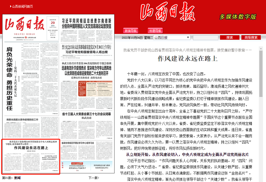 在中央八项规定制定出台十周年、全省上下喜迎党的二十大胜利召开之际,“严守铁规矩——山西省贯彻落实中央八项规定精神专题展”于国庆节这个重要节点前在全国率先开展,集中展现党的十八大以来,省委、省纪委监委坚定不移落实中央八项规定精神、驰而不息推进作风建设、深刻改变山西面貌的生动实践和重大成果。连日来,省直有关部门党员干部纷纷前来参观学习,接受教育。大家表示,从严治党从来不会一蹴而就,作风建设必须久久为功,要一以贯之落实中央八项规定精神,持之以恒纠“四风”树新风,把好传统带进新征程,将好作风弘扬在新时代。