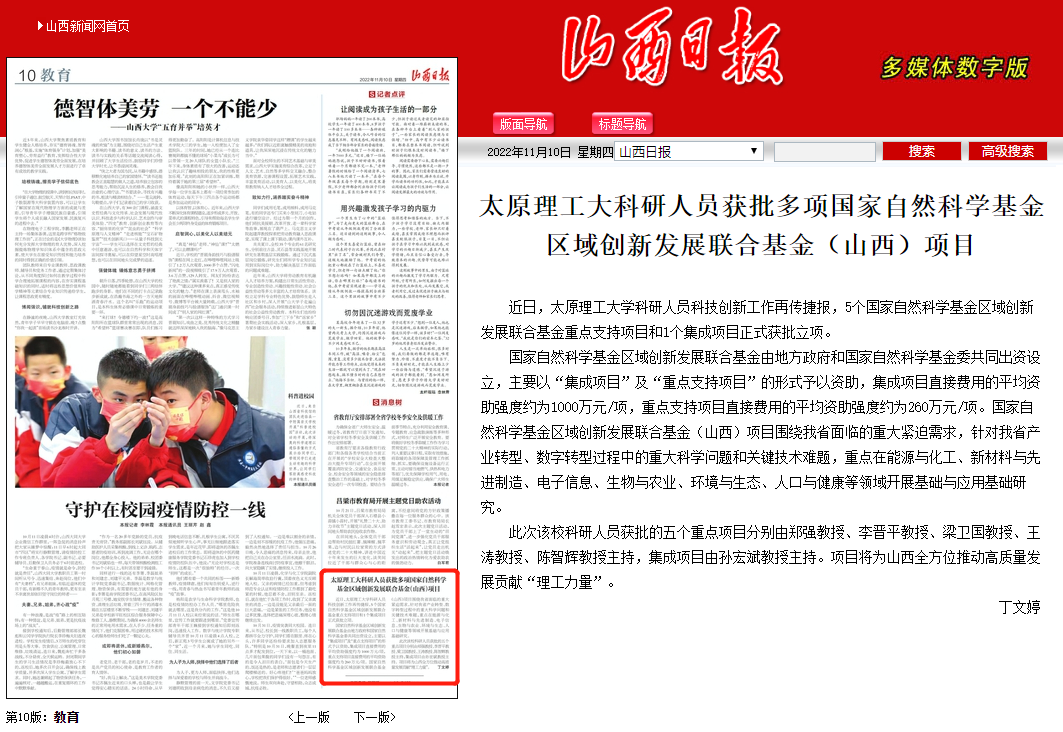 太原理工大科研人员获批多项国家自然科学基金区域创新发展联合基金(山西)项目